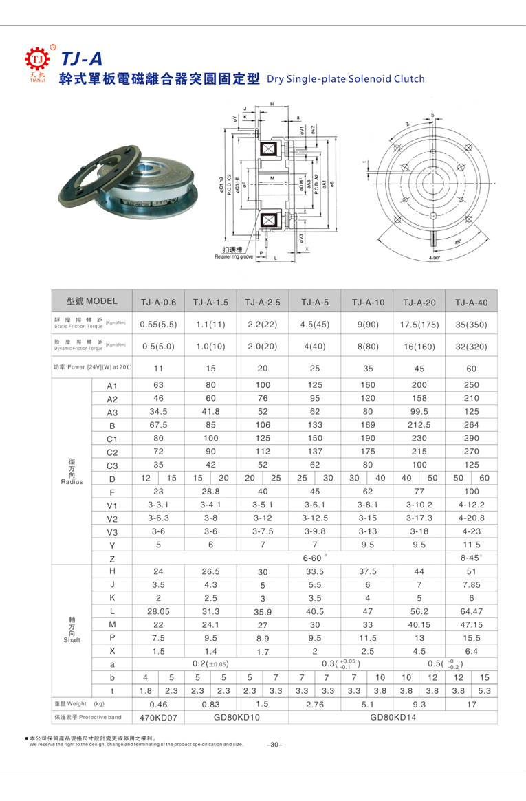 直流24V电磁离合器(干式单板电磁离合器)型号选型参数表如下: