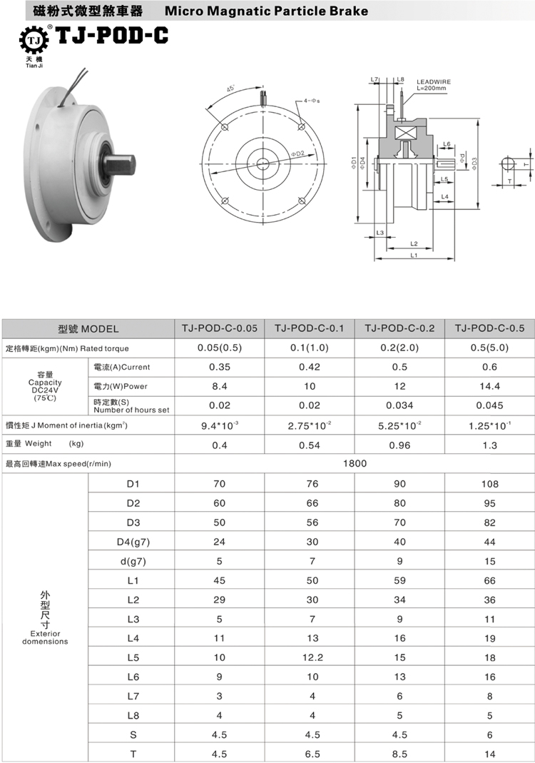 小型磁粉制动器又称微型磁粉制动器也称磁粉刹车器,统一的型号为TJ-POD-C,使用的电压都是DC24V,它激磁电流虽小,但却可以输出较大转矩,从而可以很方便地组成自动控制系统。小型磁粉制动器价格和微型磁粉制动器价格也是一样的,磁粉制动器的价格与转矩大小体积有关,体积越大价格越贵,转矩越大价格越贵,如小型磁粉制动器价格按转矩大小价格分为0.5Nm小型磁粉制动器价格为1500元,1Nm小型磁粉制动器价格为1450元,2Nm小型磁粉制动器价格为1400元,5Nm小型磁粉制动器价格为1500元。