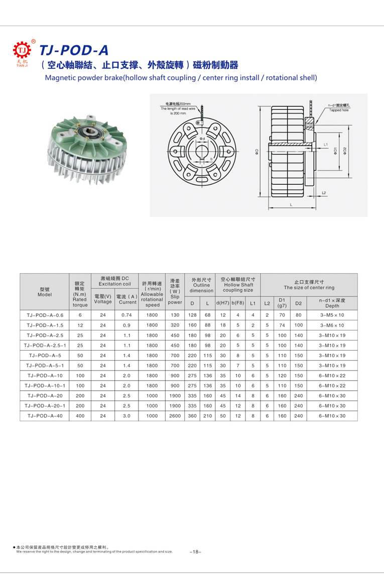 外壳旋转磁粉刹车器型号有:TJ-POD-A-0.6、TJ-POD-A-1.5、TJ-POD-A-2.5、TJ-POD-A-5、TJ-POD-A-10、TJ-POD-A-20、TJ-POD-A-40等更大的磁粉刹车器;